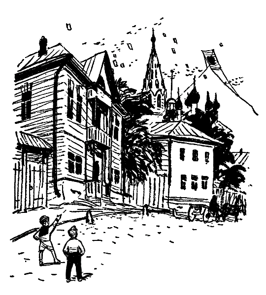 Николо-Завальская улица была в Т-е, в городе нашего с Костей детства. Когда-то, в древние времена, тут проходил оборонный вал, позже в конце улицы построили церковь Николаю-угоднику — так и получилось: «Николо-Завальская». На этой улице мы жили и пускали бумажных змеев. Наши дворы были рядом. Через три двора от нас жили Лукьяновы — те гоняли голубей. И на каждой улице, во всём городе так: тут гнездились змеевики, там голубятники. Это было до революции, мы были ещё мальчишками и потому никуда, кроме как на дачи или в недалёкие школьные экскурсии, не ездили и не видали других городов, — может быть, там ребята занимались чем-нибудь другим. Но у нас в Т-е только или змеи или голуби. Это можно было сказать, ещё не въезжая в город. …С юга или севера, с юго-востока или северо-запада подходил вечером поезд к Т-е, но уже издали открывалась дорогая сердцу картина. Прежде всего появлялась колокольня церкви «Всех святых». Мало того, что она была высока, она ещё стояла на горе и потому первой показывалась и последней пропадала из глаз. Сначала, кроме колокольни, ничего не было видно. Но вот поезд ближе и ближе… И вдруг в чистом вечернем воздухе, освещённые закатным солнцем, показывались сотни бумажных змеев — белых, красных, синих, зелёных, жёлтых, — стоящих над городом. Одни — ниже, другие — выше; одни только запускаются и, набирая высоту, то виляют хвостом, то как бы садятся на него; другие, попав под струю ветра, уже расправились, напряглись, натянули нитку и сейчас ходко выбирают её — только отпускай… А третьи змеи уже распущены на всю катушку и от высоты кажутся маленькими, недвижными, отрешёнными от земли, уже как бы переселившимися насовсем туда, на небо… И трудно поверить, что где-то, на каком-то пыльном дворике или улице, стоит курносый хозяин, который может, если пожелает, тотчас же смотать нитку и вернуть этого переселенца на небо обратно под кровать. Это «пускают». Но тут же и «гоняют». В том же чистом вечернем воздухе, освещённые тем же закатным солнцем, кружат голуби — кольцами, кольцами, словно оставляя в небе незримые венки. То стайка-кольцо, видимая с ребра и потому затенённая, кажется синей; то, развернувшись, встав на ребро, показывая белые грудки и белые нежные подкрылья голубей, стайка-венок вдруг вспыхивает розовым, закатным цветом… Змеевики и голубятники жили между собою удивительно мирно, покойно, ибо друг друга не понимали. Одни не понимали, что интересного в подёргивании нитки, на конце которой что-то болтается; другие — что интересного в круговерчении птиц, когда сам стоишь без дела. Но между собой и у змеевиков и у голубятников шла тайная и явная борьба. Даже у нас с Костей однажды из-за змея ссора была. Однако и змей же — к тому же ещё и чужой --">- 1