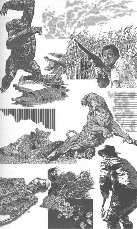 Те, кто видел фильм про Кинг-Конга знают, что это чудовище было придумано сценаристами и на самом деле I никогда не существовало. Но несколько месяцев назад в газетах появилось сообщение о том, что в лесах Бразилии живут громадные обезьяны, столь же опасные, как львы или тигры. Когда несколько лет назад путешественник Герберт Холмс вернулся из своего путешествия по безжалостное сельве, никто не поверил рассказу о его приключениях. Но сегодня общественное мнение заметно изменилось. Вот один из рассказов этого исследователя, в котором идет речь о его встрече с ужасным лесным человеком. Предоставим слово Холмсу. Я покинул небольшую лесную деревушку Сан Кристобаль всего с одним проводником, индейцем из загадочного племени ботокудос по имени Ухак. Ни один другой индеец этого племени не согласился сопровождать меня. Я собирался осмотреть одно лесное озеро, о котором индейцы рассказывали всякие ужасы, а также небольшой вулкан, считавшийся активным и весьма опасным. Ухак, высокий индеец, оказавшийся мрачным и неразговорчивым, начал разговаривать со мной только через несколько дней. Я спросил его: — Действительно ли существует Дазжо, лесной демон? — Именно потому, что он существует, я и решил сопровождать вас, — ответил Ухак. — Но почему? — Он сожрал моего брата, а у меня нет оружия, с помощью которого я смогу отомстить ему. — А ваши отравленные стрелы? — Они не причинят ему вреда. Чтобы убить его, нужны ваши пули, которые делают «хлоп-хлоп». Индейцы называют таким образом разрывные пули, которые я использовал, чтобы убивать многочисленных в этих краях кайманов. Мы больше недели пробирались через джунгли, используя тропы, проделанные крупными животными. Потом эти тропы пропали, и дальше нам пришлось пустить в дело наши мачете, чтобы пробиваться через густые заросли. Одновременно нам пришлось перейти со свежего мяса на консервы. Через несколько дней мой проводник сильно втянул носом воздух и сообщил, что мы скоро выйдем на берег интересовавшего меня озера. — Вам уже приходилось бывать раньше в этих краях? — поинтересовался я. — Конечно. Я искал здесь зеленые камни (так местные индейцы называют изумруды), и недалеко отсюда Дазжо схватил моего брата и убил его. Вы ведь убьете Дазжо, господин? Нам потребовались еще два дня, чтобы достичь озера. Я никогда еще не видел такой дикий и зловещий пейзаж. Озеро больше походило на болото, над которым клубился ядовитый пар. Вода почти везде скрывалась под толстым слоем водной растительности. На противоположном берегу я увидел столб желтого дыма — это курился вулкан. — Если ветер переменится и подует в нашу сторону, — сказал Ухак, — он принесет сюда дым, и он убьет нас, потому что этот дым ядовитый. Но в это время года ветер очень редко меняет направление, а если такое случается, то ветер обычно бывает очень слабым, и он не сможет пригнать дым к этому берегу. Он срубил несколько молодых деревьев и соорудил для нас шалаш, способный дать убежище от дождя и солнца. Болото кишело крокодилами и огромными жирными угрями, которых Ухак ловил в большом количестве. Ухак очень много времени проводил на берегу, и когда я спросил, почему он так пристально наблюдает за озером, он ответил: Я жду, когда появится Дазжо, чтобы вы убили его. Неужели он живет в озере? Да. Вероятно, его логово находится на одном из небольших остр