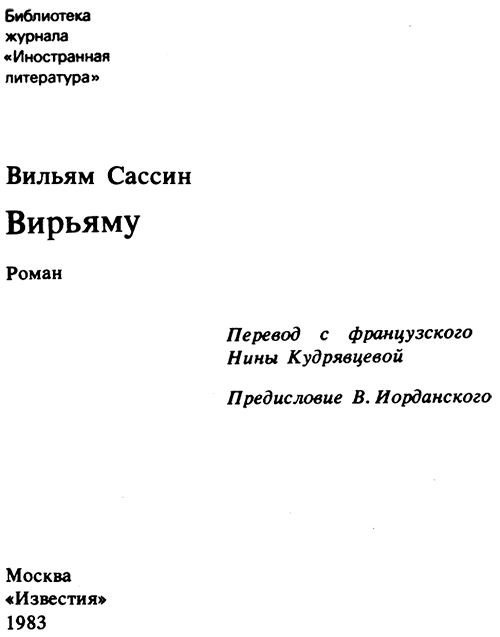 Вильям Сассин принадлежит к молодому поколению африканских писателей. Он родился в 1944 году в Канкане (Гвинея) за четырнадцать лет до завоевания его родиной независимости. Получив высшее образование в столичном Политехническом институте, он с 1966 года работает преподавателем математики, а в 1973 году выпускает свой первый роман — «Святой господин Бали», рассказывающий о работе — и нелегкой судьбе — сельского учителя. Его второй роман, «Вирьяму», выходит в свет в 1976 году, а вскоре третий — «Молодой человек из песка». Таким образом, лишь детские годы будущего писателя приходятся на время, когда его народ не был свободен, и все же, подобно писателям старшего поколения, он в своем творчестве постоянно обращается к теме колониализма. Особенно большое место она занимает в романе «Вирьяму». Почему? Ведь, казалось бы, с национальным порабощением на африканской земле давно покончено. Но писатель убежден в том, что страшное прошлое отбрасывает длинную и густую тень — тень, которая падает на современность и будущее. Один из персонажей романа «Вирьяму», старик Ондо, языком и образами народа высказывает мысль, которая очень важна для понимания взглядов писателя. Он говорит о двух душах, которые несет в себе колонизованный африканец. Самая тяжелая, потому что менее благородная и более закрепощенная, — это душа его предков. Вторая — его собственная. Первая душа, родившаяся и умершая при колониализме, отягчена всеми грехами своей прежней телесной оболочки. Каждый раз, когда ее пытаются возвысить, она столь громко расхваливает второй душе скотские наслаждения грязи, в которой прежде пребывала, что та начинает так отбиваться да противиться, что вдвоем им почти всегда удается заставить человека дрогнуть. Мысль писателя ясна. Освободиться от политического господства колониальной державы — это лишь половина дела. Важно, чтобы и люди освободились от оскверненной рабством и страхом души, стали свободны и независимы. Вирьяму — небольшая, затерянная в лесах деревушка. Где точно: в Анголе, Мозамбике, Португальской Гвинее, — Вильям Сассин не сообщает. В его глазах Вирьяму — это символ тысяч и тысяч африканских деревень, рассеянных по африканскому континенту. Но это и узел человеческих судеб, каждая из которых по-своему значительна. Повествуя о них — трагических, страшных в своей безысходности, героических, писатель стремится понять и судьбы своей родины Африки. Вильям Сассин ведет рассказ час за часом, внимательно прослеживая линии жизни своих героев до той кульминационной точки, за которой — пропасть. Хотя действие в романе сжато в несколько суток, со страшной медленностью тянется повествование, минута за минутой отсчитывающее время. Это позволяет писателю внимательно вглядеться в каждого, о ком он рассказывает. Его портреты точны, жизненны, стиль изображения реалистичен. И все же как фантастичны населяющие Вирьяму люди! Старик Келани, ищущий забвения в наркотиках, полубезумный, преследуемый демонами Ондо, пария деревни юноша-альбинос Кондело, ищущий смысла жизни и смерти писатель-неудачник Кабаланго… А рядом португальцы — ограниченный фанатик, изувер ди Аррьяга, озверевший садист Амиго… Колониализм до неузнаваемости меняет лицо человека. Для африканской литературы вообще характерно, что писатель выступает в роли учителя, в роли активно