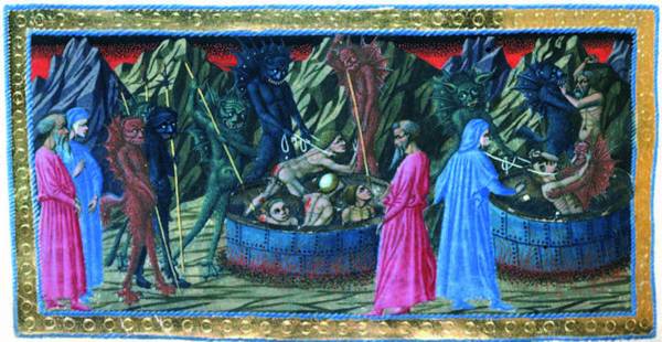 Иллюстрация: «Аликино и бесы рядом с Вергилием и Данте». Джованни ди Паоло. XV в.