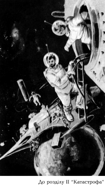 Доктор Заяц прибіг додому засапаний: — Отже, любі мої, полетите разом зі мною! — радісно вигукнув він з дверей. — Мати працюватиме на атомній електростанції, Юрко буде помічником в кабіні управління. А я — призначений командиром «Електрона»… Гана Заяцова мовчки кивнула головою. На її обличчі можна було прочитати цілу гаму почуттів: і гордість за чоловіка, і радість з приводу того, що їй виявили велику честь, включивши до складу експедиції, що вирушить в далекі зоряні світи, і деякий неспокій, і жаль за Землею, яка одразу почала здаватися неповторно прекрасною. А Юрко Заяц, сповнений самим тільки почуттям невимовної радості, відповів басом: — Дякую, тату! Ні, це вже не той хлопчина з солом'яно-жовтою чуприною, якого ми знали, а ставний стриманий юнак. Після закінчення одинадцятирічки він вступив до вищої астро-навігаційної школи, щоб стати пілотом міжпланетного корабля. І ось його мрії здійснились, — здійснились швидше, ніж він сподівався. Коли Юрко слідом за своїм батьком ступив на борт ракети, що прямувала на Місяць, він уже добре знав усе з книжок і розповідей. Здавалось, його вже ніщо не може здивувати. І все ж перший політ у міжпланетний простір був для нього суцільним хвилюванням. Його приголомшив вигляд Землі, яка все віддалялась, аж поки перетворилась на великий, огорнутий імлою глобус, що вільно плив зоряним небом. Юнак захоплювався Сонцем з його зеленкуватою короною. Однак найсильніше враження справив на нього місячний пейзаж та майже двокілометрові зорельоти, які велично зводились над аеродромом в кратері Тіхо. Юрко знав до дрібниць будову та функції всіх апаратів зоряних кораблів, та все ж, коли став віч-на-віч з творінням людського розуму, йому зробилось навіть якось моторошно. Обидва велетні стартували одночасно. Місячний пейзаж під ними швидко розростався вшир, аж поки перетворився на неозору кулю з дрібними кратерами на її поверхні. По кількох годинах польоту кораблі наблизились один до одного і з'єднались розсувним коридором, аби зробити можливим безпосередній контакт екіпажів. Земля і Місяць зникли у зоряному небі. Сонце перетворилось на яскраву зорю.* * *