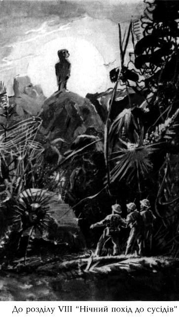 — …Якось після сильної бурі, яка промчала джунглями і повивертала з корінням чимало дерев, я знову згадав про човен, що повис, як мені здавалось, десь у плетиві гілок та ліан. Нога в мене вже загоїлась настільки, що я ходив вільно, але видиратись на дерева все ще боявся, а тому вирішив скористатись з послуг моїх друзів. Я довго намагався розтлумачити їм на мигах, який вигляд має човен та де його шукати. Франтик і Марженка ретельно повторювали за мною всі рухи, але жоден з них не зрозумів, чого я хочу. Довелось облишити цю справу. Одного дня я помітив у Франтика й Марженки дивні ознаки неспокою. Погода була чудова: в небі — ні хмаринки; джунглі дихали так тихо, що навіть листя не шелестіло, а мої приятелі чомусь покинули свою халупу і настирливо лізли в моє підземне житло. Довелось пустити їх туди, Марженка незабаром вилізла з нори і почала невідомо навіщо копати посеред галявини вузьку й глибоку яму. Працювала вона з такою наполегливістю й моторністю, що впоралася з цим завданням надзвичайно швидко. «Вона робить сховище… — подумав я. — Але навіщо воно їй потрібне?» Майже так само, як я свого часу, Марженка накрила вириту яму гілками та листям, потім взялась за те, чого я вже ніяк не сподівався: почала кидати вириту глину на покрівлю сховища. Однак вона скоро зупинилась і, наче розмірковуючи, довго дивилась на дах мого житла. «Мабуть, згадала Франтика!» — подумав я, очікуючи, що ж вона робитиме далі. Марженка раптом змінила свій початковий, задум. Тепер вона кидала глину на покрівлю вже не своєї, а моєї нори. Незабаром до подруги приєднався Франтик і допоміг їй довершити почату справу. Утрамбувавши накидану глину руками, приятелі спробували затягти мене до підземелля. При цьому обоє пищали так одчайдушно, ніби йшлося щонайменше про життя. Кінець кінцем вони забралися до нори самі я ж лишився стояти в задумі, чому Марженка за всяку ціну хотіла вкрити дах глиною? Адже зелена трава та дрібний чагарник маскували сховище далеко краще, аніж свіжий грунт… Може, квар-тянка боялась негоди і хотіла захистити покрівлю надійніше? Розгадка прийшла раніше, ніж я сподівався. Звідкись здалеку долинув підозрілий шелест, який незабаром перетворився на зловісне дзижчання. Над пралісом з'явилась хмара невідомих мені комах; потім прилетіла ще одна, значно більша. Вони закрили все небо так, що вмить стало темно. Комахи сідали на крони дерев, обліплювали стовбури, сипались на землю, заповнюючи всі джунглі. Кілька жуків сіли й на мене і таки добряче покусали. Я втік до сховища і щільно прикрив за собою «двері». Франтик і Марженка тулились одне до одного, тремтіли й пищали на таких високих нотах, що аж у вухах лящало. Кілька разів я поривався поглянути, що робиться назовні, але злякані друзі чіплялись за мої руки і верещали ще дужче. Під отой концерт я зрештою й заснув. Не знаю, скільки я проспав, але пробудження аж ніяк не було приємним: на мене посипалася суха солона глина. — А де ж Марженка й Франтик?.. Невже втекли з переляку? Я став на сходи і обережно підняв кришку… Ой леле, що трапилось?! Довколишній краєвид був такий страшний, що в мене аж стиснулося серце. Праліс зник. Скільки око сягало, навколо простягалася голісінька рівнина, на якій, мов надгробні пам'ятники на величезному кладовищі, стирчали недогризені пеньки. Хмари комах перетворили буйні джунглі на пустелю.