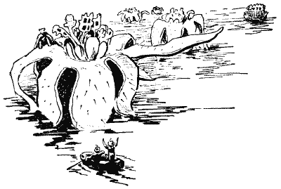 Над морем Данте клубочилися хмари диму й пари. Вода в ньому вирувала й кипіла, — так, ніби його дно було жерлом велетенського вулкана. Береги моря становили собою кам'яний хаос. Все свідчило про те, що тут відбулось кілька вулканічних вибухів такої сили, яких на нашій Землі, мабуть, не траплялось ніколи. Вертоліт кружляв пошматованим узбережжям вже не першу годину, а вчені все не могли відшукати селище квартян. — Там! Там! — вигукнув раптом Ватсон. — Погляньте, на обрії видніється силует лілії! Вертоліт швидко наближався до незвичайної будови. Вона височіла на скелястому стрімчаку, схожа скоріше на пам'ятник, ніж на жиле приміщення. Вертоліт повис у повітрі. Навратіл з Ватсоном розсувною драбиною зійшли на землю. Підійшли до споруди і застигли в скорботному мовчанні.