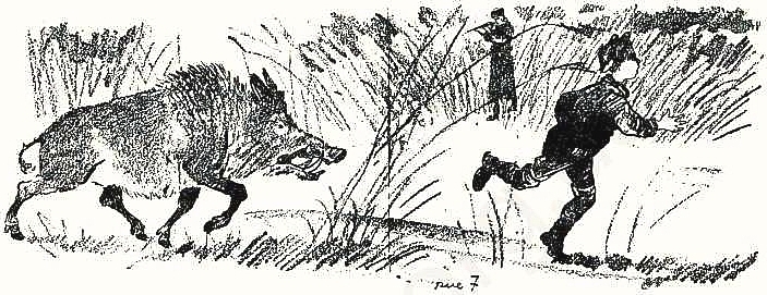 Старий кнур давно вже не спав. Скоро розляглася в Лимані луна від першого пострілу, він схопився і відтоді ввесь час чекав на гонитву. Коли вже зачув тихий плюскіт води – то Ян і Абас увіходили в озеро – він побудив свиней. Свині жалібно скиглили, враз кидалися бігти, але Хро спокійно стояв на місці, прислухався, і вони верталися до нього, збивалися в купу, знову верещали і поривалися тікати. Старий вожай стояв і вичікував. Він сам увесь трусився від хвилювання, але чекав на місці. Мозок його працював напружено, кров вогнем пульсувала коло скронь, аж очі наллялися кров'ю і на іклах зайшлася піна. Він критикував і відкидав найголовніший звірячий заповіт, залізний закон порятунку – правило вітру. Цей закон укладався в коротку фразу: «тікай проти вітру». Звір більше сповіряється на свій нюх, ніж на очі. У лісі, в кущах, в очереті, в бур'янах можна не побачити ворога. Ворог може лежати в ямі, причаїтися за горбком, сидіти на дереві. А занюхати ворога можна дуже здаля, надто з таким надзвичайним носом як у дикої свині – щоб тільки вітер наганяв запах – саме для цього і треба тікати проти вітру. І ніякі горбки, дерева, кущі, бур'яни не затьмарять нюхового видіння. Повернешся носом проти вітру – і перед тобою цілий світ запахів, справжня, яскраво освітлена, кінокартина звірів, птахів, людей, рослин. Повернешся спиною до вітру – і перед тобою запахова темрява – глибокий нюховий морок, де на кожному кроці тебе може чекати смерть, схована від очей і повита запаховою ніччю. Людина знає день і ніч – ті, що бувають для очей. Але от для багатьох звірів, які бачать неважно, а нюхають добре, світ і темрява нічого не значать. Для них головне те, – чи є запахи, чи їх не чути. Коли ніяких запахів не чути, – а це буває тоді, як біжиш за вітром, – то це для такого звіра все одно, що ніч – носом нічого не видно. І от звірі бояться такої запахової ночі, їм страшно, все одно як людині поночі – бо не чути, чи є вороги попереду, чи їх нема. На очі свої такі звірі мало сповіряються. Тим то такий звір завжди тікає проти вітру. Вітер наганяє на нього всякі запахи і він не так боїться. Він проти вітру ніби бачить своїм носом. От він і тікає проти вітру в запаховий день. Оцей самий закон вітру зараз критикував Хро. За півхвилини собаки будуть тут, на острові, і доведеться тікати. Треба по закону тікати проти вітру. І Хро знав, що проходу не буде, що всі виходи противітрової путі будуть зайняті людьми. Буває. що вдається проскочити між грізних запахів людського поту і чорного пороху, але частіше потрапляєш під громи й дим з людських рушниць. А там, з того боку, звідки йшли собаки, людей було зовсім мало, і на сто ступнів від собачої путі можна було певно й спокійно утекти між очеретами. Так міркував Хро і жижки йому трусилися від хвилювання. Інший ватажок уже давно був би стрімголов тікав проти вітру, і люди уже були б стріляли. Але Хро стояв, аж високе тужливе скавчання задзвеніло близько, на сусідньому острівцеві. Тоді щось шубовснуло у воду – то собаки наближались плавом. Їхній вожай скавчав чимраз вище й пронизливіше, нюхом він уже ясно бачив вепрів і навіть знав, скільки їх є перед ним. Нерви в старого кнура були напнуті, як струна, залізний закон вітру бився в кожній вені і смикав ноги в усіх суглобах. Далі чекати було несила. І Хро, покірний законові, повернувся носом проти вітру, щоб тікати. А