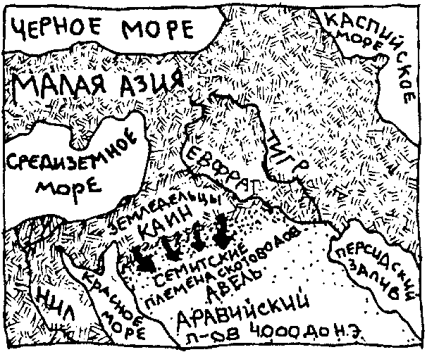 Прочтя все три версии, я поднял глаза на Измаила и сказал: — Вот что происходило на границе: Каин убивал Авеля. Земледельцы орошали почву своих полей кровью пастухов-семитов. — Конечно. То, что происходило там, происходит всегда на всех границах экспансии Согласных: Несогласные истребляются, чтобы можно было обрабатывать больше земель. — Измаил снова взял свой блокнот и открыл его на собственной карте того периода. — Как видишь, земледельцы распространились по всему региону — кроме земель, занятых семитами. На границе, отделяющей пахарей от пастухов, противостоят друг другу Каин и Авель.