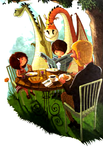 Франци постучалась в дверь. Из дома драконов никто не отозвался. Франци постучала ещё раз, потом постучал Шурли. Наконец в доме послышались шаги. Дверь открыл Мартин и впустил детей. — Мы были на кухне, — объяснил он. — Занимались кулинарией. Из кухни появился Георг. На нём был клетчатый передник. — Добро пожаловать, уважаемые друзья! — провозгласил он. Франци и Шурли смотрели на него в замешательстве. — Ой, прошу прощения, — сказал Георг, виновато разводя крыльями. — Со мной иногда бывает. Потом только спохватываюсь. — А пахнет как здорово! — одобрил Шурли. — Мне тоже нравится, — сказала Франци. — Всё из консервов, — объяснил Георг. — Мы открыли целых двадцать банок. Они расположились на веранде, на свежем воздухе. Мартин подал на стол. Франци и Шурли были поражены, что еда из консервных банок может оказаться такой вкусной.