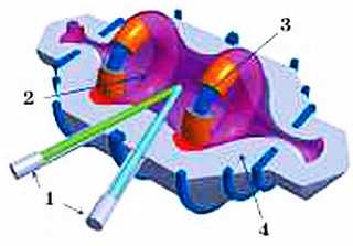 Схема компактного реактора фирмы Lockheed Martin. Цифрами обозначено: 1 — трубы инжекторов, 2 — стабилизированный шнур плазмы, 3 —сверхпроводные магниты, 4 — защитный кожух