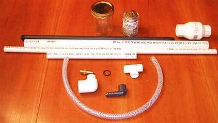 — 4 отрезка сантехнической ПВХ-трубы диаметром в 1 дюйм; — 4 отрезка такой же трубы диаметром 1/2 дюйма; — 4 отрезка ПВХ-трубы диаметром 3/4 дюйма с тонкими стенками; — однодюймовый сантехнический ПВХ-клапан; — клапан диаметром в 1/2 дюйма; — прозрачная виниловая трубка диаметром 1/2 дюйма; — соответствующий ей по диаметру полудюймовый штуцер; — ПВХ-трубка диаметром 1/2 дюйма, соответствующая штуцеру; — переходник для соединения однодюймовой ПВХ-трубы с аналогичной диаметром 1/2 дюйма; — резиновое уплотнительное кольцо, оно должно плотно прилегать к дюймовой трубе, но свободно пропускать полудюймовую ПВХ-трубу.