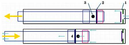 На схеме цифрами показано: 1 — отверстие для прохода воздуха из цилиндра внутрь трубки поршня; 2 — резиновое уплотнительное кольцо в крайнем правом положении; 3 — воздушный клапан в открытом состоянии; 4 — уплотнительное кольцо в крайнем левом положении (стрелками слева показано направление перемещения поршня в цилиндре).