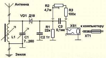 (Продолжение. Начало см. в «ЮТ» № 3-2015 г.)Следующие достоинства выявляются, если обратиться к схеме детекторного приемника для компьютера, показанной на рисунке. Длинную антенну вы вряд ли сделаете, а антенна короче 10 м оказывается электрически малой в диапазонах ДВ и СВ. Емкость антенны можно оценить из расчета 6…10 пФ на метр длины провода (зависит от его толщины и наличия окружающих предметов). Таким образом, емкость антенны не превзойдет 60…100 пФ, поэтому ее можно подключить ко всему контуру. Если же антенна длиннее, между ней и контуром следует включить конденсатор емкостью от 5,6 до 68 пФ. Чем меньше эта емкость, тем слабее связь с антенной и меньше потери, вносимые ею в контур. Этим несколько повышается селективность (избирательность) контура. Основу приемника составляют колебательный контур L1, C1 и детекторный диод VD1. В моих экспериментах использовалась готовая катушка СВ от магнитной антенны (МА) старого транзисторного приемника. Вставляя и вынимая ферритовый стержень от той же МА, удается в больших пределах регулировать индуктивность L1. При самостоятельном изготовлении катушки ферритовый стержень (или его обломок, мы ведь не используем катушку как МА, чувствительность детекторного для этого недостаточна) надо обмотать двумя-тремя слоями плотной бумаги, пропитать полученную гильзу парафином и намотать в один слой виток к витку 60.70 витков провода ПЭЛШО 0,22.0,35, а лучше — литцендрата.