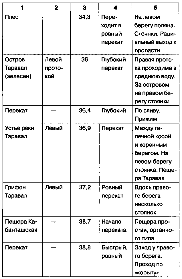 А теперь присядем на дорожку и в путь! Черемуховый остров прижат к левому берегу реки. Левая протока непроходима, а правая, широкая и быстрая, имеет узкий слив с песчаной отмелью в самом ее конце. За ней начинается глубокий и длинный плес. Величественные правобережные скалы отражаются в его синеве. Вдоль левого берега вниз по течению тянется поселок Агидель. Там, где заканчиваются его строения, русло реки перекрывается отмелью, по перекату которого с берега на берег проходит автомобильный брод. Следует идти серединой переката, несколько придерживаясь левого берега. Перекат заканчивается узким сливом. В маловодные годы здесь придется вылезать и проводить суда вручную. За отвесной левобережной скалой начинается длинный плес, в котором много больших подводных камней. Они из-за медленного течения реки практически не «читаются». Следует быть внимательным и придерживаться правого пойменного берега. В конце плеса русло реки перегорожено галечной отмелью. В июне — июле здесь возможно появление галечных островов. Поэтому советуем, подходя к перекату, держаться ближе левого коренного берега, а затем, пройдя мелководье, отойти на середину каменистого русла реки. В случае необходимости ночлега удобная стоянка находится на правом галечном берегу. Дров много. Впереди длинный каменистый перекат типа небольшой шиверки, суженный надводными и подводными камнями. Следует держаться ближе к правому берегу. Вскоре течение выравнивается, продолжая оставаться быстрым. За последние20–25 лет этот перекат неузнаваемо изменился. Некогда пенящиеся в русле камни почти исчезли. Справа появилась песчаная отмель, а за ней песчаная заиленная мякоть с удобным для причаливания заливом. Былая мощь левобережной скалы, называемой народом «Три брата», бесследно исчезла. Исчезла и деревня Ишдавлетово, что стояла в километре ниже. Сейчас она восстанавливается, отодвинувшись от прибрежной зоны на несколько сотен метров, ближе к покатому склону правого коренного берега. Об этом месте народ говорит, что здесь, в узости слива переката, находились три больших подводных камня, чуть накрытых пенными бурунами. При прохождении их на плотах требовались сноровка, немалый опыт и недюжинная сила плотогонов. Когда-то о них и разбился плот с тремя братьями-плотогонами. В память о них камни эти и скалу стали называть «Тремя братьями». С давних пор только тот лоцман признавался на реке Белой искусным, кто много раз без аварий проводил плоты или барки-беляны через «Трех братьев». Сразу за этим перекатом на правом песчаном берегу находится удобная стоянка. Ею следует воспользоваться, если вы вышли на маршрут из Бурзяна ближе к вечеру, часов в 5–6. В противном случае нет гарантии, что вам удастся найти подходящую стоянку для ночлега. Ушедшие раньше вас группы уже заняли их. Глубокий Ишдавлетовский плес, начинающийся от левобережных отполированных водой скал, заканчивается у острова. Следует держаться ближе к правому берегу. Узкая правая протока уходит к левому берегу, образует несложный прижим и проносит вас вниз по течению к неширокой каменистой правобережной пойменной террасе. Здесь, у самого уреза воды, имеется небольшой родник. Напротив, на высоком левом берегу, расположено несколько мест для лагеря. Дров много. Впереди глубокий каменистый перекат. Проходится он по цент