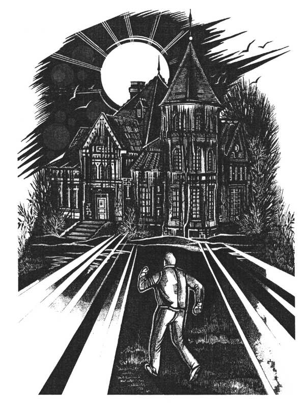Где-то в доме однообразно стрекотал сверчок. Медленно и упорно капала вода. Ветер грохотал под широкими карнизами. Мэллори обошёл труп кругом, одна рука покойника была отброшена в сторону, голова повёрнута набок, волосы длинные, глянцево-чёрные, кучерявившиеся на мощной шее. Одет мертвец был в длинный плащ бутылочно-зелёного цвета, узкие рыжеватые брюки, блестящие черные ботинки, длиной до середины голени. На манжетах и горле виднелись смятые кружева. Умер он, как прикинул Мэллори, не раньше, чем несколько дней назад, щёки ввалились, лицо приобрело зеленоватую бледность, но разложение ещё не началось. Он прошёл дальше, в большую комнату, наполненную тенями. Звёздный свет лился через высокие окна, занавешенные полусгнившими шторами. Потрескавшийся и вздувшийся паркет местами прикрывали остатки ковров. Выцветшие обои в стиле барокко свисали со стен, покрытых тёмными деревянными панелями. Были там и картины в массивных рамах, изображавшие мужчин и женщин в старинных костюмах. По комнате были расставлены тяжёлые стулья и диваны, их обивка разлезлась и превратилась в лохмотья, через которые виднелись ржавые пружины и выцветшая набивка. Пока Мэллори пересекал эту комнату, направляясь в следующую, дорогу ему перебежала мышь. Следующая комната, в которую вела арка, была заставлена книжными полками, на которых громоздились перепачканные тараканами книжные корешки. Бумаги валялись на сгнившем ковре, среди лоскутов пыли. Порывы холодного ветра, проникавшего через выбитое окно, почти полностью заглушались листвой большой ветви, проросшей внутрь. Парадная лестница, широко изгибаясь, вела на второй этаж. Высокие спальни, расположенные там, были обставлены в том же вычурном стиле и пребывали в том же упадке, что и комнаты внизу. В задней части дома Мэллори обнаружил кухню с высокими деревянными стойками, угольной плитой и ручным насосом, стоявшим рядом с чугунными раковинами. Дверь кухни выходила в задушенный сорняками сад с тропинками и фонтаном, почти скрытом за разросшимся кустарником. Дерево толщиной в фут проросло сквозь разломанные плиты террасы. Дальше сквозь растительность, высотой до плеч стоящему человеку, виднелись руины беседки. – Чтобы это значило? – вполголоса задал Мэллори вопрос сам себе. – Что это за место? Я бывал здесь раньше? Он повернулся и стал рассматривать высокую, узкую, выкрашенную коричневой краской дверь в стене, обитой планками шириной в дюйм. Он попробовал повернуть большую коричневую фарфоровую ручку. Дверь открылась внутрь, за ней обнаружилась пыльная площадка и пролёт крутых деревянных ступеней. Мэллори стоял, всматриваясь в полнейшую темноту, царившую внизу. Сырой запах влажной кладки и ядовитых грибов достиг его ноздрей. – Привет, – позвал он. – Есть кто дома? Голос вернулся приглушённым эхом. Он чувствовал себя совершенно нереально, словно в бреду. – Далековато забрался, – пробормотал он. – Могу уж увидеть всё. Нетвердой походкой, вцепившись в изношенные деревянные перила, Мэллори стал пробираться по ступенькам. На полпути вниз ему пришлось остановиться и подождать пока пройдёт головокружение. На дне кармана он нащупал коробок спичек. С трудом он зажёг одну из них. В неверном свете он разглядел каменный пол, корпус древней угольной печи, бак для угля позади неё, и в дальней стене этой, похожей на 