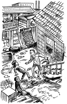 Хорошенько прицелившись, Энциклопедия метнул мяч точнёхонько на брезент, под которым, судя по выпуклости, что-то лежало. На этот раз ребята успели сами вбежать на задний двор, пробираясь средь битого кирпича, старых автопокрышек, сломанных кроватей и ширм. Энциклопедия подобрал мяч и хотел было приподнять угол брезента, но тут выскочил Задира и, потрясая кулаками, заорал: