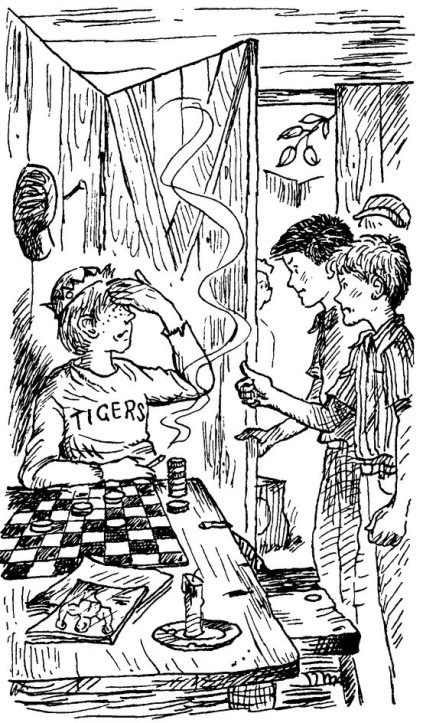 У «тигров» был сборный пункт — заброшенный сарай позади кузовной мастерской мистера Суини. Энциклопедия и Элджернон застали Жучилу в одиночестве. Он играл в шашки сам с собой и притом жульничал с обеих сторон.