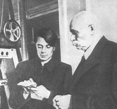 Е. О. Патон со старшим сыном Владимиром возле сварочного автомата (1948 г.).