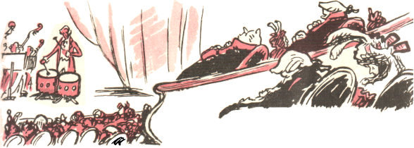 Эту картину и музыку сразу все узнали и назвали. Все читали сказку Пушкина и знали музыку Римского-Корсакова, потому что в прошлом году мы сами сделали музыкальный диафильм об этой сказке и несколько раз его смотрели. Для малышей мы выбирали музыку более простую. Например, мы показали им картину «Деревянные солдатики» под «Марш деревянных солдатиков» Чайковского. Солдатиками были наряжены шесть самых маленьких мальчиков из I класса. Они сделали шаг, будто маршируя, и замерли на ходу. А когда показывали картину «Клоуны» (под музыку Д. Кабалевского «Клоуны»), на сцене стояли два самых смешливых и веселых ученика, наряженные клоунами. Мы хотели подготовить и другие картины: «Фея Драже», «Китайский танец» из «Щелкунчика», «Садко» из оперы Римского-Корсакова (сидит Садко на берегу Ильмень-озера, а к нему выходит Морская царевна), встречу витязя Фарлафа со злой волшебницей Наиной из оперы Глинки «Руслан и Людмила», —но не успели.