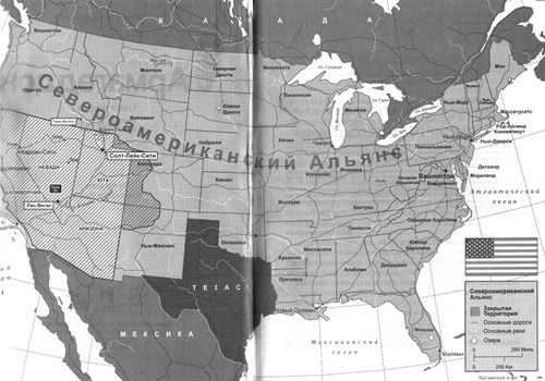 Джей-Ти сидел в заброшенном сувенирном магазинчике и высматривал, нет ли здесь чего полезного. Погромы, случившиеся в дни Катастрофы, и тщательные зачистки магазинов, особенно продуктовых и скобяных, регулярно производимые потом, миновали эту небольшую лавочку по причине полной непригодности ее ассортимента. Умирающему куску цивилизации ни к чему оказались пластиковые макеты мормонского молельного дома Табернакл и собора Солт-Лейк, равно как и карты Большого Соленого озера или легкой железной дороги Метролинк. Джей-Ти перевернул пол-лавочки вверх дном, тщетно пытаясь найти карту самого Солт-Лейк-Сити, но кроме дурацких открыток с панорамой города на фоне горы ничего не нашел. Все, что обнаружил Джей-Ти, это завалившийся под груду туристических брошюр складной нож с символикой зимних Олимпийских игр 2002 года. В качестве оружия — крайне сомнительно, но ничего другого под рукой не было. Светало, и бывший рэпер задумался, как поступить дальше. Судя по слою пыли и целым рыболовным сетям паутины, в сувенирную лавчонку давно никто не забредал, поэтому можно было провести день здесь. С другой стороны, несколько раз осторожно выглядывая наружу, он заметил, что чернокожих на улицах довольно много. Видимо, в этом районе города они и живут. А для белого, как известно, все негры — на одно лицо. Тем более для белого, который негров не любит — а Джей-Ти пока сталкивался здесь только с подобными. Выбравшись из магазинчика и чуть-чуть изменив внешность, можно было спокойно добраться до озера, не привлекая особого внимания. С внешностью Профессор справился легко: нахлобучил на голову зеленую бейсболку с эмблемой национального парка Антилоуп, надел дешевые солнцезащитные очки с пластмассовыми стеклами. Сверху полевой куртки пришлась как нельзя впору широкая майка с логотипом яхтклуба Солт-Лейк. Немного разорванная по шву, она не заинтересовала мародеров и валялась на пустой полке. — Вряд ли у них тут всем раздали фотороботы, правда, братан?! — спросил сам у себя Джей-Ти и, оглядевшись, выскользнул из магазинчика. Никто не обратил на него внимания. Бывший рэпер угадал верно: в данной части города было организовано негритянское гетто, которое охранялось спустя рукава. Хорошего здесь было мало, но имея кусок хлеба и даже выпивку по праздникам, как говорил старый Абрахам, чернокожие предпочитали эти нехитрые блага сомнительным перспективам выживания за пределами города. Разумеется, кто-то убегал, кого-то ловили и наказывали, но в целом гетто жило своей собственной, довольно спокойной жизнью. В конце концов, рассуждали многие его обитатели, их деды и прадеды как-то ведь жили в годы оголтелого расизма южных Штатов. Что поделать, если время повернулось вспять? Правильно, устраиваться по мере возможностей. И Клем, и Роулинсон могли дать полезный совет Ростиславу и его спутницам — уходить именно через гетто. Но Роулинсон просто умолчал об этом, а Клем даже и не подумал, да и знать не знал. Поэтому Шибанов с девушками двинулись к свободе сложным путем, а Джей-Ти — довольно простым. Он шел по растрескавшемуся тротуару, поглядывая по сторонам. Навстречу попадались в основном пожилые женщины, спешившие по хозяйственным делам, и детишки, мал мала меньше. Дети были одеты в разномастные обноски, один карапуз сидел на кевларовом армейском шлеме, который, судя по 