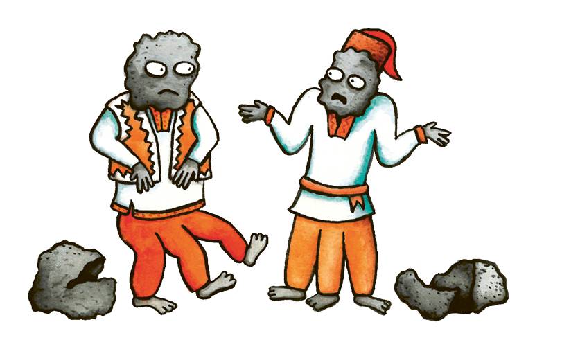 Я заплющив очі й захотів понад усе опинитись у Підгірцях, на нашому базарі, де не їдять зміюк, де продають вареники та співають знайомих пісень. Нас зірвало зі скелі й почало крутити, мов кульбабку в повітрі. Я тримався за Василя з усіх сил, аж раптом відчув, що вітер зник, як і звук бурі. А потому ми попадали на бруківку, боляче забились, і я закричав, але не від болю, а від радощів, адже чарівна сорочка врятувала нас в останній момент і перенесла саме туди, куди я і хотів: на нашу ринкову площу.