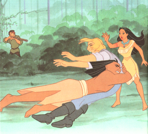 В это же мгновение на поляне появился Кокоум! Увидев Покахонтас в объятиях Джона, индеец решил, что чужак напал на девушку, и набросился на него! Но один из друзей Джона — Томас — видел все и выстрелил в Кокоума!