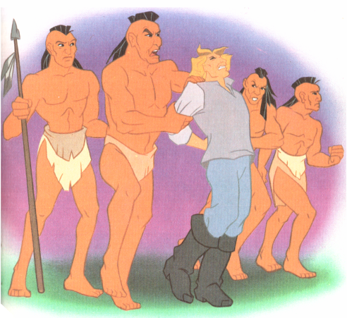 Несколько индейцев из племени Покахонтас, притаившись за деревьями, следили за незнакомцами. Они никак не могли понять, зачем те перекопали всю землю в округе. Но один из моряков вдруг заметил лежащего в засаде индейца и выстрелил в него!