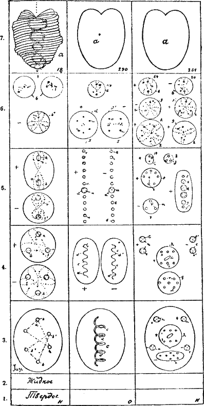 Когда мы рассматриваем материалы, присущие этой сфере, нас поражает их огромное разнообразие, неисчислимые различия в составах окружающих нас минералов, растений, животных, которые все различаются по своим составным частям: жестким или мягким, прозрачным или непрозрачным, хрупким или гибким, горьким или сладким, приятным или неприятным, окрашенным или бесцветным. Из всего этого смешения выделяются три подразделения материи как основная классификация: материя твердая, жидкая и газообразная. Дальнейшее расследование показывает, что все эти твердые, жидкие и газообразные вещества образуются из комбинаций несравненно более простых тел, называемых химиками элементами, и что эти элементы могут существовать в твердом, жидком и газообразном состоянии, нисколько не изменяя при этом присущей им природы. Так, химический элемент кислород является составной частью дерева и, в комбинации с другими элементами, составляет твердое волокно дерева; он же, в соединении с другими элементами, встречается в соке дерева как жидкость и в то же время существует сам по себе как газ. Во всех трех состояниях это ― все тот же кислород. Далее чистый кислород может быть переведен из газообразного в жидкое, а из жидкого в твердое состояние, оставаясь при этом тем же чистым кислородом, и то же самое относится и ко всем другим элементам. Таким образом, мы получим три подразделения или состояния материи в физической сфере: твердое, жидкое и газообразное. Исследуя далее, мы находим четвертое состояние ― эфир, а более тщательное расследование открывает нам, что эфир, в свою очередь, существует в четырех состояниях, столь же отличных одно от другого, как состояния твердое, жидкое и газообразное. Возьмем снова как пример кислород: так же, как его можно перевести из газообразного состояния в жидкое и твердое, так же он может перейти по восходящей линии из газообразного состояния в четыре более тонкие эфирные состояния, последнее из которых являет собой первичный физический атом; дальнейшее разложение этого первичного физическом атома переведет его из состояния физического в сверхфизическое, в состояние следующей за физической сферы. В прилагаемой таблице три газа: водород, кислород и азот показаны в состоянии газообразном и в четырех эфирных состояниях; на этой таблице видно, что структура первичного физического атома для всех трех газов одна и та же и что разнообразие так называемых «элементов» происходит от разнообразия способов, посредством которых первичные атомы соединяются между собою. Таким образом, седьмое подразделение физической духа-материи состоит из однородных атомов, шестое образуется из довольно простых комбинаций однородных атомов, причем каждая комбинация действует как единица. Пятое подразделение образуется из более сложных комбинаций, четвертое из еще более сложных, но во всех случаях комбинации эти действуют как единицы; третье подразделение состоит из комбинаций еще более сложных, рассматриваемых химиками как газообразные атомы элементов, и в этом подразделении многие комбинации получили определенные названия, как: кислород, водород, азот, хлор и т. д.; точно так же получают названия и все вновь открываемые комбинации. Второе подразделение состоит из комбинаций в жидком состоянии, причисляют ли их к элементам, как бром, или к со