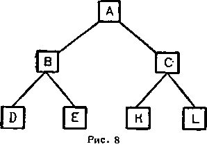 Все охватываемые понятием предметы последовательно распределяются по классам. Каждый класс в свою очередь разделяется на низшие классы, каждый из этих последних классов в свою очередь разделяется на еще низшие и т. д. Таким образом, классифицируемые предметы в результате классификации составляют стройную и развернутую систему, и каждый член классификации получает в этой системе своё постоянное, устойчивое место. Примерная схема классификации будет следующая: делимое понятие А делится на два низших понятия В и С; В делится также на два низших понятия D и Е, а С — на К и L; каждое из этих последних понятий также делится на два низших понятия, и т. д. Всё это в совокупности будет классификацией, потому что все предметы разделены по группам сверху донизу и каждая из этих групп занимает определенное место (см. рис. 8).