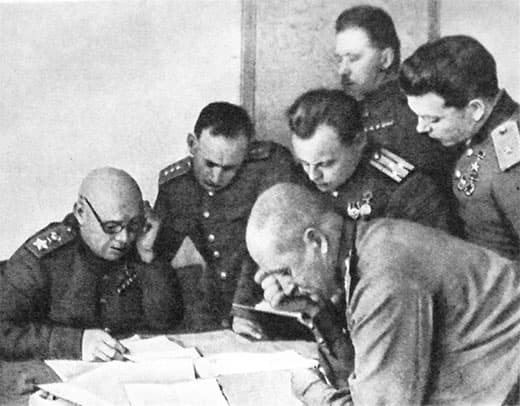 Перед форсированием Керченского пролива. Маршал Советского Союза С. К. Тимошенко утверждает решение командарма. На переднем плане — И. Е. Петров