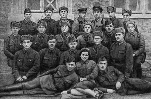 Начальник политотдела 18-й армии Л. И. Брежнев (сидит крайний справа) и начальник политотдела 16-го стрелкового корпуса П. А. Штахановский (сидит в центре) среди политработников 107-й отдельной стрелковой бригады