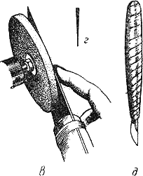 Рис. 4. Полукруглые стамески и резцы: а — полотно и шейка стандартной полукруглой средней стамески; б — вид на переднюю, вогнутую пласть (лицо) и сечения полукруглой отлогой стамески, выполненной из стандартной прямой стамески; в — поперечное сечение отлогой, средней и крутой стандартных стамесок; г — чертеж полотна полукруглого резца, изготовленного из круглого напильника; д — вытачивание канавки на стержне путем его изгиба; е — резец, изготовленный из круглого стержня сверлением канала с его торца.