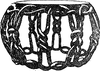 Рис. 20. Кулон «Кубик» из полированной древесины с бронзовыми отчеканеными накладками (увеличено). Примеры орнамента на гранях кубика из точеных бронзовых гвоздиков (виноградная кисть с листьями, инициалы и др.)