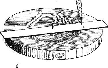 Прежде чем начать вытачивать кольца, нужно подобрать подходящую заготовку — любой длины круглую палку или сучок древесины, причем лучше подобрать сырые заготовки. Перечислим наиболее подходящие для точения породы дерева, начиная с лучших: орех черный, бук,слива черная, ольха красная, каштан, береза, клен, ясень. Осина, липа и тополь точатся плохо. Работая с разными породами деревьев, автор убедился, что отлично обрабатывается древесина лимона, хорошо точится и свежая яблоня. Сухая древесина яблони часто бывает рыхлая, с трещинами, точится она хуже сырой, резец на ней оставляет рваный след (чтобы получить чистую поверхность, лучше при точении древесину смачивать). Из яблони получаются очень красивые кольца. Также хорош в этом смысле терн, особенно если удается сделать кольца из темной заболони (ядро у терна светлое и рыхлое) Такие кольца получаются темно-коричневые, иногда желтовато-красными пятнами и разводами. Удивительно красивые по цвету, темные, с разводами, как будто из камня, получаются кольца из ядра рябинового дерева. Но древесина эта очень капризна в точении. В сыром виде она настолько мягкая и гибкая, что выточенное кольцо мнется, разрывается. Работать можно только с хорошо просушенными заготовками, причем соблюдай осторожность. Но точится и полируется она очень хорошо. Прекрасно точится сирень, даже сухая. Она очень твердая, при точении и полировке не дает никаких изъянов, и цвет ее интересный ―глубокий темно-охристый. Ну и бук является одной из лучших для точении древесин. Из бука, как известно, делают круглые палочки (для детских кроваток и манежей) ― отличные заготовки для колец. Когда заготовки подобраны, можно приступать к изготовлению колец. Прежде всего сделаем оправку (обойму), которая крепится на дрели и в которой будут обрабатываться кольца. Для оправки подойдет деревянный цилиндр диаметром 35 им и длиной около 45 мм. Оправку следует укрепить на коническом хвостовике шпинделя дрели, для чего в ней сверлится сквозное отверстие такого диаметра, чтобы оправку можно было плотно насадить на шпиндель (расточить на конус отверстие можно ножом и круглым напильником). Теперь нужно обтачивать оправку, но для этого придется сначала сделать упорную стойку для режущего инструмента. По высоте упорная стойка вместе с планкой (см. рис. 13) подгоняется так, чтобы опирающийся на них точильный инструмент был на уровне оси шпинделя. С помощью маленького круглого резца диаметром около 6 мм проточим в оправке отверстие по диаметру плоских кружков-заготовок для колец глубиной около 16 мм. Резец при этом надо подавать понемногу, чтобы оправка не пробуксовывала на шпинделе. Кончиком ножа, держа его в горизонтальной плоскости зачистим стенки образовавшегося отверстия на конус, но так, чтобы конусность была совсем небольшая. В это коническое отверстие с небольшим усилием вставим (на 1–2 мм) заготовку и отрежем от нее кружок толщиной около 5 мм. Заготовив необходимое чисто кружков, приступим к их дальнейшей обработке. Укрепив кружок в оправке, а он удерживается в ней за счет конусности отверстия, подровняем его по плоскости торца оправки, слегка ударяя по кружку молоточком. Если диаметр отверстия в оправке больше диаметра кружка, обернем последний кусочком бумажной прокладки в один или два слоя. Маленьким резцом высверлим в кружке отв