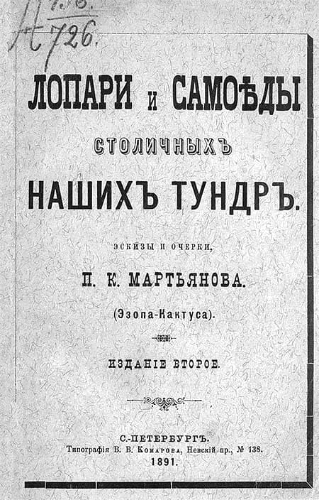 ЛОПАРИ И САМОѢДЫ СТОЛИЧНЫХЪ НАШИХЪ ТУНДРЪ. Эскизы и очерки, П. К. Мартьянова. (Эзопа-Кактуса). Изданіе второе