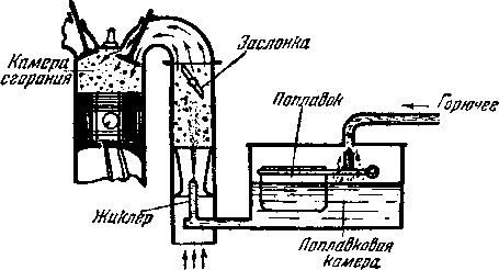 Такая же строгая определённость существует и в установке зажигания. Искра подаётся только в тот цилиндр, где сжимается горючая смесь. Схема электрического зажигания представлена на рисунке 11. Источником электроэнергии для зажигания служит аккумуляторная батарея. При работе мотора аккумулятор непрерывно заряжается небольшой динамомашиной. Она даёт ток, вращаясь от мотора. Но напряжение аккумулятора слишком мало. Оно равно лишь 6—12 вольтам и не может создать сильную искру в цилиндре. Поэтому низкое напряжение с аккумулятора подводится через особый прерыватель к катушке, создающей высокое напряжение, бобине. Бобина устроена так, что при непрерывном замыкании и размыкании подводимого к ней тока повышает напряжение его с 6—12 вольт до нескольких тысяч вольт. Это напряжение может давать очень сильную искру, которая и зажигает сжатую горючую смесь. Распределяет искры по цилиндрам особый распределитель, связанный через зубчатые колёса с валом двигателя. Высокое напряжение подводится от бобины по электрическому проводу к вращающейся пластинке распределителя — ротору. Положение ротора строго определено положением коленчатого вала. Ротор подводит высокое напряжение к свече именно того цилиндра, где в данное мгновение должна проскочить искра. Вращаясь, распределитель не только передаёт искру в цилиндры к свечам зажигания, но и одновременно прерывает ток аккумулятора, подводимый к бобине, создавая тем самым высокое напряжение. Один провод от бобины идёт через распределитель к свече, второй соединяется с корпусом двигателя. Искра создаётся, как уже говорилось, в цилиндре с помощью свечи, ввинчиваемой в головку блока. Внутри этой свечи находится фарфоровая трубка — изолятор, сквозь которую проходит центральный электрод. Электрическая искра проскакивает между этим электродом и боковыми электродами (усиками), соединёнными с корпусом двигателя. Теперь посмотрим, как поступает в цилиндр горючее. На моторе имеется небольшой прибор — карбюратор (рис. 12). Карбюратор смешивает пары бензина с воздухом. Действие его основано на том, что при такте всасывания поршень втягивает в цилиндр воздух через особую трубу карбюратора, создавая в последнем разрежение. В этой трубе укреплена тоненькая трубочка с горючим, называемая жиклером. Горючее так подведено к жиклеру, что, доходя до самого края трубки, оно не вытекает. Но стоит только двигателю начать работать, как воздух устремится сквозь карбюратор, и воздушная струя начнёт высасывать горючее из трубки. При этом, подобно тому, как это происходит в парикмахерском пульверизаторе, струйка бензина распыляется и, превратившись в пар, смешивается с воздухом. Полученная горючая смесь попадает как раз в тот цилиндр, куда в данный момент открыт впускной клапан.