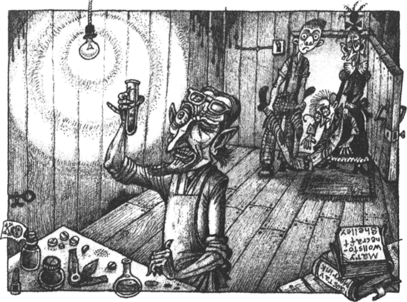 Химика окружают злобные античетвероногие. Он еле уклоняется от летящих камней. Наводит кишку и окуривает бунтарей. Их злоба мгновенно тает: выпадают камни, дубины из рук, тела обмякают, лица делаются идиотическими, они улыбаются и сюсюкают.Голоса: — Мы больше не будем шалить… — Ты хороший папочка. — Папочка, можно тебе поцеловать ручку?