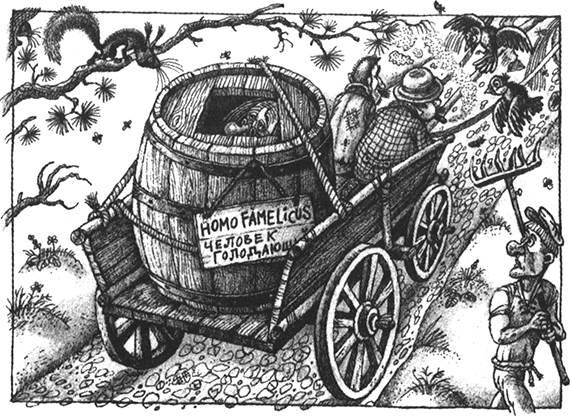 Между ними снует кельнер. На нем поверх шкуры белый передник, в руках салфетка и номер на голой груди.Первый. Мюль, слыхали? Акции обтесанных камней повышаются… Второй. Э… очередной бум и спекуляция. Кремневая промышленность в застое. Третий. По секрету… Завтра ожидается подъем акций Охотничьего синдиката… Говорят, обнаружены новые следы кошек и собак. Второй. Кто эту брехню разносит по кочевью? Первый. Шауф, наверно. Третий. Говорят, Шауф за биржевые спекуляции с акциями посажан в пещеру. Второй. Этого мало. Нужно было отдать его на растерзание льву. Первый. Алло, кельнер! Что у нас на завтрак? Кельнер. Травка «сеш», козье молоко «а-ла-дюамель», пюре из сосновой коры. Первый. Травка «сеш», только побольше соусу. Второй. Молоко козье.