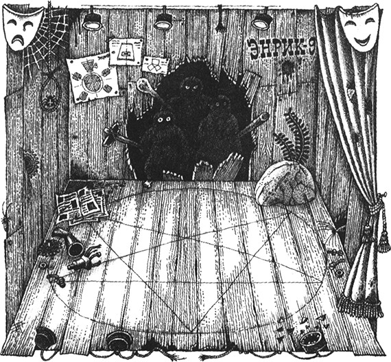 — Если вы не приобретете моего гороскопа… вы погибнете, ибо не узнаете опасных дней и смертельных для вас звезд, — шептал зловонным ртом астролог на ухо Куарту и цепко держал его острыми пальцами. Слева вниз, в темноту, крутилась винтовая лестница. Куарт схватил астролога за тонкую шею… Ощутил его острый кадык и — сбросил в винт лестницы. Тело астролога завертелось, как мясо, втягиваемое в мясорубку… Куарт бросился в темный зал. Сердце вот-вот расколется. Темнота. Скрип. Это скрипит бешено вращающийся круглый стол… Он вертится, как костлявый астролог, падающий в темноту лестницы. Над вертящимся столом перекошенные от страха, освещенные снизу, маски спиритов. Луч высвечивает где-то в темноте вверху лицо спиритической кликуши. Она выкрикивает: — Цепь… Руки на стол… Вращайте… Вращайте, заклинаю вас, стол! Цепь! Со свистам, мельканием огней вертятся стол и маски. Из свистопляски несутся голоса: — Цепь! — Держитесь! — У меня голова… кружится… — Быстрее! Быстрее! — Что вы чувствуете? — Боль в желудке. — А еще? А еще? — Немного страшно… — Ага! Значит, дух здесь. — «Он» здесь! — Где? — «Он» здесь! Я чувствую тебя, великий дух! «Он» здесь. Он все-ля-ет-ся в меня. Ах! Инженер Куарт выскочил обратно. У него разламывалась голова от какофонии выкриков кликуш, юродивых, прорицателей. Он с трудом добрел до Зала Рефератов. Там был яркий свет. Зал был полон, и на эстраду уже поднимался магистр антропософии Эраст Мальгор.Глава XI, в которой во Дворце Духа появляются дикари с дубинами!