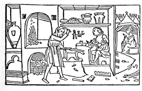 Неизвестный венецианский художник XV в. Кузница. Из Библии Малерми. 1490 г. Гравюра на дереве.— Почему ты меня отталкиваешь? — удивился хряк. — Не я разве справил тебе этот благородный наряд? На его слова она, заносчивая, высокомерно ответила: — Ни ты сам, ни твое свиное королевство ничего мне не справляли. — А как скоро пришло время укладываться на покой, сказала: — Нынче же ночью, пусть только его сморит сон, я убью его. Хряк, бывший неподалеку, все слышал, однако смолчал. И вот, подойдя в должный час, как был в навозе и в грязи, к роскошной постели, он рылом и лапами откинул тончайшие простыни и, все испакостив смердящими нечистотами, лег рядышком с женой. Последняя довольно скоро уснула. Хряк же, который лишь прикидывался спящим, до того сильно ранил ее острым клыком в грудь, что она тут же умерла. Встав поутру в урочное время, он отправился, по своему обыкновению, пастись и валяться в грязи. Королеве пришло на ум проведать невестку, и, обнаружив ее убитую сыном, она страх как расстроилась. Когда хряк вернулся домой и был встречен суровыми упреками королевы, он сказал, что сделал с женою то, что она намеревалась сделать с ним, и, разобиженный, ушел. Минуло некоторое время, и хряк снова принялся докучать матери, твердя, что хочет жениться на другой сестре; хотя королева решительно его отговаривала, он упрямо стоял на своем, грозя в противном случае учинить вокруг настоящий погром. Услыхав это, королева поспешила к мужу и все ему передала; и король сказал, что сына не худо бы убить, не то он, чего доброго, натворит бед в городе. Но королева была матерью, очень любила сына и не мыслила жизни без него, пусть даже он был свиньей. И вот, призвав бедную женщину с другой дочерью, она долго с ними говорила; и после долгого разговора о замужестве вторая дочь согласилась взять хряка в мужья. Однако ж на деле все вышло не так, как она рассчитывала, ибо тот убил ее подобно первой своей жене и тут же ушел из дому. А когда он, заляпанный грязью и нечистотами до того, что к нему из-за вони невозможно было приблизиться, воротился в обычный час во дворец, король с королевой очень бранили его за жестокость. Но хряк отвечал им, что сделал с женою то, что она намеревалась сделать с ним. И опять минуло некоторое время, и мессер хряк снова пристал к королеве, что хочет жениться, — на сей раз на третьей сестре, еще большей красавице, чем первые две. Получив на свою просьбу решительный отказ, он принялся не просить, а требовать, в ужасных и грубых выражениях угрожая королеве смертью, если его не женят, на ком он хочет. Непристойные и омерзительные эти слова столь удручающе подействовали на королеву, что та едва не лишилась рассудка. И, ни о чем больше не думая, она послала за бедной женщиной и за третьей ее дочерью, которую звали Мельдина, и сказала: — Мельдина, дочь моя, я хочу, чтобы ты стала женой мессера хряка; уважь не его, а короля и меня; если ты уживешься с с нашим сыном, ты сделаешься самой счастливой и довольной женщиной на свете. На это Мельдина, не переменившись в лице и не моргнув глазом, ответила, что она рада-радешенька и очень благодарна королеве за предложенную честь и за желание видеть ее своей невесткой. И даже если бы она ничего больше не получила, с нее было бы достаточно того, что она, бедная девушка, станет невесткой могущественного короля. Растроганная этими благодарным