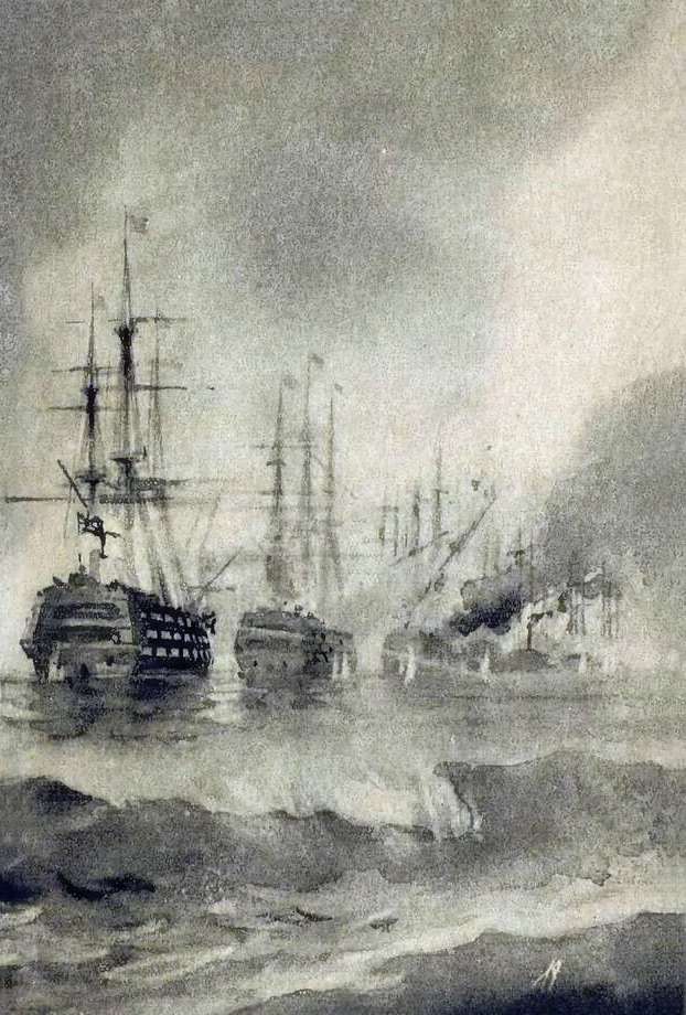 После долгого и утомительного плавания русский военный фрегат «Аврора» на всех парусах, легко рассекая океанскую волну, вошел в перуанский порт Кальяо. Был апрель 1854 года. Розовый утренний туман рассеялся, и город, весь залитый светом, открылся чудесной панорамой. Воздух был так прозрачно чист, что даже с далекого рейда отчетливо виднелись контуры каждого строения. На левом берегу бухты высилась древняя крепость; справа, почти у самой линии прибоя, стояли виллы местной знати; за ними теснились крутыми уступами маленькие домишки с черепичными крышами. И повсюду тянулись к небу вечнозеленые кипарисовые рощи, высокие тополя, а дальше, к волнистой линии горизонта, виднелись Горы. Военные корабли под английским и французским флагами стояли на рейде. Здесь были трехмачтовые фрегаты, быстроходные бриги, корветы, шхуны. «Аврора», ответив на приветствия военных кораблей иностранных государств, убрала паруса и стала на якорь. Плавание «Авроры» было тяжелым. Из Портсмута в Рио-де-Жанейро шли при сильном волнении в океане. Мыс Горн обогнули в самое бурное время года. Тихий океан встретил фрегат переменными ветрами, частыми грозами, проливными дождями и шквалами. Все это сильно измучило команду «Авроры». Сейчас все были довольны, что наконец пристали к берегу, и радовались предстоящему отдыху в порту. К фрегату приблизилась шлюпка с таможенным чиновником. Теперь уже недолго осталось ждать разрешения съехать на берег. Свободные от вахты матросы, столпившись на баке, с любопытством приглядывались к очертаниям города и оживленно переговаривались. — Что за народ здесь живет? — спросил молодой матрос писаря Егоркина. — Известно какой! — с веселой издевкой ответил Егоркин. — Тут живет портовый народ. Марсовый матрос Сунцов строго посмотрел на писаря: — Ты толком отвечай, когда спрашивают. Нечего зубы скалить! — А тебе что? Чего лезешь? — покосился на него Егоркин. — Давно линьков не пробовал? — Вот постой, на берег съедем — я тебе линьки попомню, поквитаемся! Егоркин отошел в сторону. Василий Чайкин, высокий матрос с широким, скуластым лицом, слушавший эту перебранку, покачал головой: — Напрасно ты его зацепляешь. В недобрый час напакостит. — Был бы ему ход, давно бы всех извел, — сдерживая гнев, проговорил Сунцов. Смелый и опытный матрос, Сунцов был резок на язык, дух протеста всегда жил в его сердце, и из-за того он частенько подвергался порке. Его били много раз, но матрос, живучий и крепкий, быстро оправлялся и не становился податливей. На корабле «Николай-чудотворец» он получил сто ударов. Еле живого его доставили в госпиталь. Все думали, что Сунцов не выдержит той порки. Но, провалявшись в больнице несколько месяцев, матрос оправился. «Николай-чудотворец» к тому времени ушел в плавание, и Сунцова приписали к «Авроре». Хотя порка на «Авроре» не имела такого распространения, как на других судах, но и здесь ему один раз уже пришлось лечь под линьки. На это и намекал писарь Егоркин. На юте оживленно переговаривались офицеры. Разговор шел о порте Кальяо, о службе, о жалованье, о быстроходности кораблей. И только один молодой офицер, казалось, не разделял всеобщего оживления. Это был лейтенант Николай Оболенский, совершавший свое первое кругосветное плавание. Невысокого роста, широкий в плечах, с лицом, покрытым крепким загаром, он, облокотившись о б