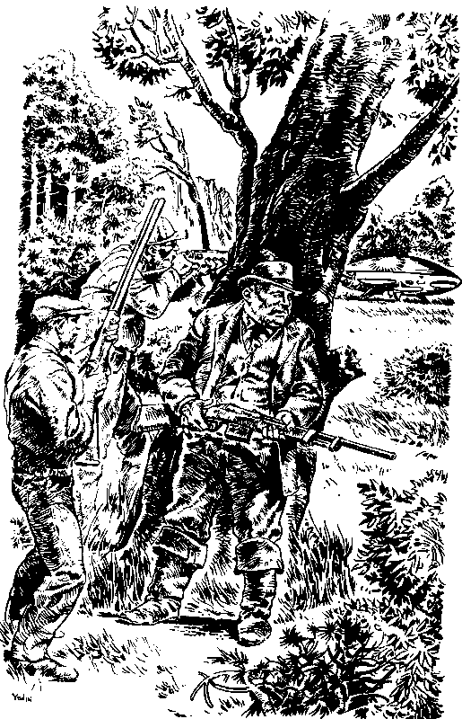 — Как тебе известно,- начал Клэр,- я неплохой охотник. Или, во всяком случае, считаюсь таковым, хотя и нечасто беру в руки ружье. Кое-какие природные данные, а главное большое везенье, и в результате я никогда не возвращаюсь домой с пустым ягдташем. Так вот, первого октября прошлого года — хорошенько запомни дату!- уже смеркалось, а я еще ничего не подстрелил. В другое время меня бы это нисколько не огорчило: я предпочитаю наблюдать за живыми животными, а не убивать их, потому что и так убиваю, к сожалению, слишком многих для своих опытов. Но через день я пригласил к себе мэра Руффиньяка, чтобы он помог мне в одном деле. А этот человек любит дичь. И вот я решил немного побраконьерствовать с фонарем. Солнце только село, когда я шел через поляну Манью, что посредине леса. Да ты ее знаешь так же хорошо, как и я: она вся заросла вереском и утесником, а вокруг стоят дубы и каштаны. Днем эта поляна довольно живописна, но в сумерках производит зловещее впечатление. Я не из слабонервных, однако и мне захотелось поскорее выбраться из лесу. Уже на краю поляны я запнулся о корень, с размаху ударился головой о ствол дуба и тут же потерял сознание. Очнувшись, я не стал произносить классических слов вроде «где я?». Голова раскалывалась, в ушах гудело, и сначала я боялся, что проломил себе череп. К счастью, страхи мои оказались напрасными. Часы на руке показывали час, ночь была непроглядной, ветер крепчал, ломая ветки деревьев. Потом над поляной показалась луна, вынырнув из-за темного облака; края его были похожи на волшебные светящиеся кружева. Я сел и начал искать свое ружье, которое, по счастью, незадолго до этого разрядил. Некоторое время я шарил руками среди мокрой травы и гнилых сучьев, пока не нащупал приклада. Опираясь на ружье, как ни палку, я начал медленно подниматься. Лицо мое было обращено в сторону поляны. По мере того как я поднимался, в поле моего зрения попадали все новые и новые предметы, и наконец я увидел эту штуку. Сначала она показалась мне черной массой, чем-то вроде купола, возвышавшегося над кустами вереска и почти неразличимого в темноте. Но вот луна на мгновение вынырнула из-за туч, и тогда, словно при вспышке молнии, я увидел выпуклый панцирь, сверкающий, как металл. Признаться, мне стало страшно. От поляны Манью до ближайшей дороги прямиком через лес добрых полчаса ходьбы, а с тех пор, как умер старый оригинал, подаривший этому месту свое имя, здесь иной раз по неделям не бывает ни души. Я потихоньку двинулся вперед, добрался до края лесной чащи и, притаившись за стволом каштана, начал осматривать поляну. Там все было неподвижно. Ни проблеска, ни огонька. Только эта неясная масса — еще более плотная тьма на фоне черного леса. Затем ветер сразу стих.В тишине, едва нарушаемой потрескиванием сухих сучьев- верно, кабан шел по тропе, — я вдруг услышал слабый стон. Ты знаешь, я врач. Поэтому, еще толком не придя в себя, я решил прежде всего оказать помощь существу, которое так стонало; это явно были стоны не зверя,а человека.Отыскав фонарь,я включил его,направив луч света прямо перед собой. Он отразился от огромного металлического панциря чечевицеобразной формы. Я приблизился к нему с бьющимся сердцем. Жалобные стоны доносились с противоположной стороны. Я обогнул этот панцирь, застревая в кустах, натыкаясь на колючки утесника, бормоча проклятия и спотык
