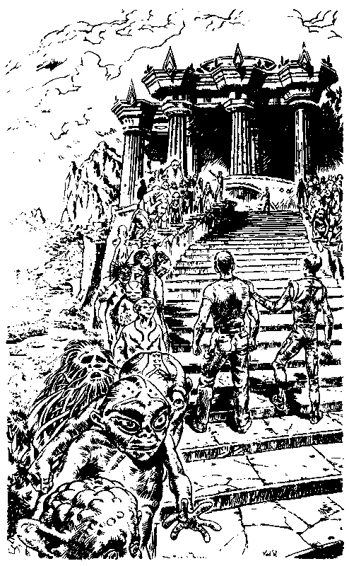 Клепсидра показывает час рассвета. Мы выходим один за другим под бледный свет рождающегося дня. У основания скалы намело много песка. И я иду, опустив голову, хмурый и лишённый надежды. Крики! Я поднимаю глаза. Там, на площадке, на полпути от лагеря людей неба виднеется силуэт! Маэми! Моё сердце подпрыгивает от радости, затем снова падает. Маэми опозорена! Бог её отверг, и мы, народ гюисов, навлекли на себя неудовольствие бога, удача нас покинет! Маэми приближается к нам медленным шагом, тихо плача. Орбло задаёт ей вопрос. Она качает головой, она ничего не видела, но она слышала крики в лагере людей неба, видела большие огни, и видела, как машина Пьера улетела на юг к Двери бога. Я бегом отправляюсь к лагерю. Пьер уже там, у него грустный и одновременно сердитый вид, а Джек сидит на ступеньках лестницы и плачет. Другие чужаки с враждебным видом смыкаются позади меня. Сердитый начальник убит, а Мери исчезла и, несомненно, тоже мертва. Мери? Мери была избрана! Я пытаюсь им объяснить, какая большая честь им оказана, что им будет улыбаться удача, но они кричат на своём варварском языке, и, если бы не Пьер, они бы растерзали меня. Пьер берёт меня за руку, заводит в одну из комнат, и говорит мне, что нет никакого бога, а есть только разумное животное, внезапно появившееся из другого времени, и что Мери была им съедена. Я этому не верю! Я не хочу этому верить.! Мери мертва, и Маэми скоро…ПЬЕР