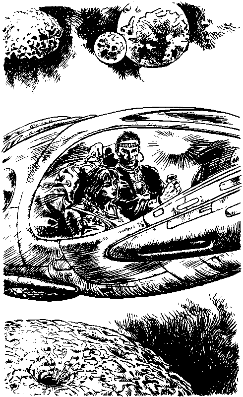 К моему величайшему сожалению, посадка произошла ночью. Когда мы вошли в атмосферу Эллы, мои часы показывали 7.20, но я так и не знаю чего — утра или вечера по земному времени. Облачность была настолько густой, что за короткий промежуток — пока мы не вошли в тень планеты — я почти ничего не смог различить внизу: лишь какие-то мерцающие поверхности в разрывах между тучами, видимо моря. Приземлились мы совершенно бесшумно, без всяких толчков. Ксилл опустился среди голой темной равнины. Вдалеке едва виднелось несколько слабых огоньков.