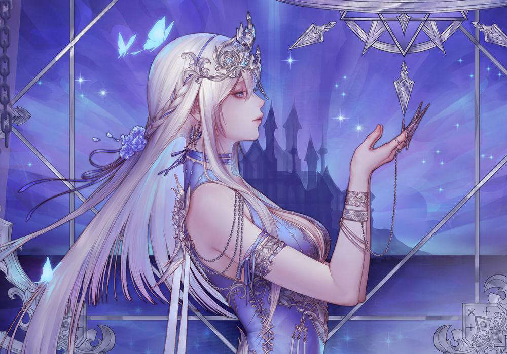 Длинные светлые волосы, заплетённые в косу с цветами. Тонкий носик с небольшой родинкой под ним. Пухлые губки, обведённые красной помадой. Зелёные глаза, горящие азартом и жаждой приключений. Белое длинное платье с широким вырезом декольте под большую объёмную грудь, в центре которой был виден небольшой шрам, как напоминание о совершённой ошибке.