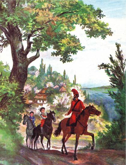 Тих и покоен широкий Днепр. По берегам его тянутся заросли ивняка. Куда ни глянь — степь без конца и края. Среди степи раскинулись донские станицы. На холмах, на косогорах лепятся хатки под соломенными крышами, утопающие в белоснежной кипени вишнёвых садов. Ветер колышет кроны деревьев, шепчется в листве, поднимает в небо стаи легкокрылых белых лепестков: видно, потому он и зовётся в здешних местах вишнёвый. Закружившись метелицей, лепестки опускаются на зеркальную гладь воды, на дорогу, на крышу большого деревянного дома, где недавно поселились Давыдовы. С виду дом важный и пышный, однако зимой и осенью в нём холодно и неуютно. Полковник Василий Денисович Давыдов прозвал его за это театром. Но его сыну Дениске дом нравится: в нём легко прятаться от взрослых по шкафам и чуланам, играть в казаков-разбойников, скакать… Нравится и маленькое, утопающее в садах украинское село со вкусным названием Грушёвка. Отец Дениса, командир Полтавского легкоконного полка, должен был по роду службы переезжать с места на место. Вместе с ним отправлялась в дорогу и вся семья. Мать Елена Евдокимовна печалилась, но Денису была по душе кочевая жизнь. Сколько вокруг необычного: огни солдатских биваков, зов полковых труб, быстрые марши… А тут пришло радостное известие: командующим войсками Екатеринославского корпуса назначается генерал-аншеф Александр Васильевич Суворов. Новость эту полтавцы встретили с ликованием. Полковник Давыдов приосанился и сказал, торжествуя: «Велика честь!» Василий Денисович весьма почитал бесстрашного полководца и сыновей своих старался воспитать в «суворовском духе». Спали они на жёсткой постели, вставали с первыми петухами, обливались холодной водой. В те годы дворяне часто приглашали для воспитания детей иностранцев. Следуя моде, Елена Евдокимовна тоже взяла в учителя француза Шарля Фремона. Однако Василий Денисович не больно-то доверял гувернёру: он непременно хотел, чтобы сыновья его стали истинными сынами своего Отечества, и потому приставил к ним «дядькою» могучего донского казака Филиппа Михайловича Ежова. Бывалый казак обучал детей верховой езде, обращению с оружием, в подробностях рассказывал про походы Румянцева, Потёмкина, битвы Суворова — и картины жарких былых сражений оживали перед глазами мальчиков. Правда, характерами и вкусами братья мало походили друг на друга. Толстый и медлительный Евдоким предпочитал скачке на лошади и фехтованию плавные танцы и уроки французского языка. Денис же, напротив, был живым, быстрым, деятельным. Метко стрелял, доплывал на спор до середины Днепра, любил военные игры. Зато светские манеры: поклоны, учтивость, шарканье ножкой, которым старался обучить гувернёр месье Шарль Фремон, — не давались ему. Иной раз после схватки с другом Андрейкой в овраге, разгорячённый, в глине с ног до головы, Денис шумно вбегал в гостиную и бросался отцу на шею. Елена Евдокимовна в ужасе поднимала к небу глаза, а Шарль Фремон безнадёжно и печально разводил руками: — О, этот месье Ежов! Он-таки испортит ребёнка. Как-то ночью Денис проснулся от невообразимого шума и грохота копыт. Мальчик распахнул окно и увидел скачущих на конях всадников, спешащих куда-то с криками лакеев, кучеров, повара.