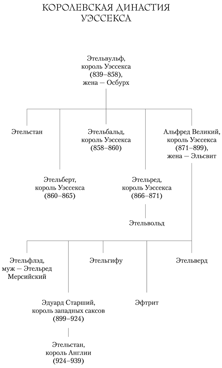 Без сомнения, у читателей есть свои любимые варианты в том списке, который я привожу ниже. Но я принимаю написание, предложенное «Оксфордским словарем английских географических названий», хотя словарь, разумеется, не является истиной в последней инстанции. В упомянутом словаре приводятся написания, относящиеся примерно ко времени правления Альфреда – 871–899 годам н. э.; к примеру, название острова Хайлинга в 956 году писалось и «Хейлинсиге», и «Хаэглингейгге». Сам я тоже не был слишком последователен, прибегая к современному написанию «Англия» вместо «Инглаланд», используя «Нортумбрия» вместо «Нортхюмбралонд» и в то же время давая понять, что границы древнего королевства не совпадали с границами современного графства.