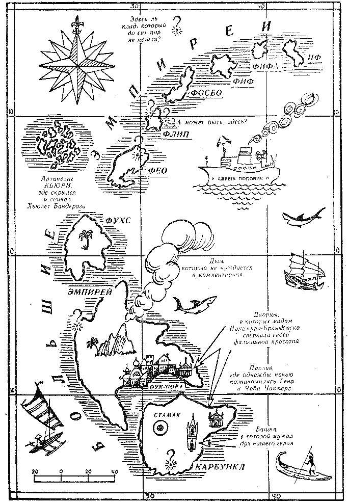 Вдоль правого борта с дымящимися фитилями в руках стояли его канониры, и все, как замечено было с башен, в плохом настроении. — Какую еще вам красавицу Марго? — крикнул долговязый Маркус Джереми Йон, представитель одной из старейших семей архипелага. — Сами знаете какую! — заорал Бархатный Чарли. — Отдавайте немедленно! Открываю огонь всем правым бортом! Впоследствии выяснилось, что его любезная красавица Марго, сбежавшая с «Белого лебедя» на Ямайке, нашла себе пристанище на островах Кьюри, где и одичала вместе со своим возлюбленным Хьюлетом Бандерогой. Бандерога же перед бегством сумел ввести в заблуждение Бархатного Чарли, чем навлек на черепичные крыши Оук-порта град каленых ядер. Битва продолжалась около трех часов. Островитяне, кое-чему научившиеся за истекшие столетия, смогли дать наглецам достойный отпор. Когда Бархатный Чарли очнулся в развороченном им до неузнаваемости трактире «Синька», к нему подвели юную Юкко-Паулину Йон, племянницу Маркуса Джереми. — Не та ли это, кого вы искали, храбрый моряк? — Собственно говоря, ничего общего, — прорычал Бархатный Чарли, потирая ушибленную рукояткой пистолета голову. — Да, собственно говоря, это и не имеет никакого значения… Вот вам пример. Негодяи Бархатного Чарли, которые могли бы причинить столько горя жителям Цейлона, Бенгалии, Австралии и Чили (а именно такие были у негодяев планы), превратились на нашем архипелаге в мирных скобарей, виноградарей, рыбаков или просто в бездельников, а страшилище южных морей «Белый лебедь» стал «прогуливать» в своих трюмах местное вино «Горный дубняк» для придания ему должного вкуса. Больше того, сам Бархатный Чарли, для которого в Британском адмиралтействе давно была свита пеньковая веревка, стал почтенным гражданином Оук-порта, а впоследствии первым президентом Республики Большие Эмпиреи и Карбункл. Именно он, Чарли-Велюр, завез на архипелаг любимую игру лондонской голытьбы, известную теперь всему миру под названием «футбол», и именно эта игра принесла ему неслыханную популярность. Так на солнечных пляжах и в тенистых лесах формировалась прелюбопытнейшая нация Больших Эмпиреев и ее невероятный язык, вобравший в себя лаконичность кассиопейского, певучесть малазийского, высокопарность португальского, мужественность английского, образность пиратского жаргона и разные замечательные качества многих других лексиконов. Любой мизантроп, попав на архипелаг, становился оптимистом и шутником и растворялся в добродушном, веселом, немного ленивом, но талантливом местном населении. И только лишь самые отъявленные негодяи и мрачные скопидомы не могли прижиться на красивых островах. Они пересекали пролив и высаживались на базальтовые скалы единственного неприветливого острова до всем архипелаге — острова Карбункл. Их влекла туда дурацкая лживая легенда, которая и дала имя этому острову. Легенда гласила, что Хьюлет Бандерога, перед тем как скрыться и одичать на архипелаге Кьюри, штормовой ночью высадился на этом острове и закопал где-то там невероятнейший драгоценный камень — карбункул — величиной со страусиное яйцо. Где мог достать свистун Бандерога такой ценный предмет, легенда не объясняла, да это и не нужно было тупым маньякам-кладоискателям. Пошлые призраки богатства и власти влекли этих людей на остров, базальтовые скалы кото