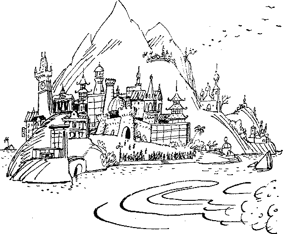 В помещении столовой висела карта Республики Большие Эмпиреи и Карбункл. Архипелаг напоминал перевернутую вниз головой запятую. Десятки крошечных необитаемых островов грядой-загогулиной тянулись к югу, к голове, к сравнительно большому острову Эмпирей со столицей Оук-портом и ко второму по величине острову Карбункл. Перед картой стоял с указкой перпом Хрящиков с лицом удивленного льва. — Ну вот, товарищи, — сказал он, откашлявшись, — сегодня мы лицом к лицу столкнулись с парадоксом мира чистогана, где каждый мазурик, купив подводную лодку, может превратить законный отдых в чистый ад. В нашей стране такого безобразия быть не может, это всем ясно. Капитан поручил передать мне благодарность экипажу за выдержку, четкость. От себя скажу, что в этом эпизоде мы себя ничем не скомпрометировали, и это большой плюс. Теперь главное. Мы идем с дружеским визитом в город Оук-порт. Никогда прежде нога советского человека не ступала на эту отдаленную территорию. — Вообще-то ступала, — сказал вдруг из третьего ряда плотник Телескопов. — Моя нога и ступала, Лев Африканович. — А с вами, Телескопов, разговор будет особый! — прикрикнул на него Хрящиков и сделал какую-то пометку в своем блокноте. — Итак, продолжаю. Нога туда, товарищи, — перпом метнул суровый взгляд на невинную физиономию Телескопова, — не ступала. Население там, товарищи, очень неопределенной нации и имеет неопределенный язык, который мы должны уважать, хотя некоторым и смешно. — Он снова взглянул на Телескопова. — Стоять там будем три дня с тремя целями. Первая цель — сдадим спасенных нами граждан разных стран. Вторая цель — пополним запасы пресной воды и продовольствия. И третья, может быть самая главная, — покажем жителям далекой, но близкой страны истинное лицо советского народа. Следующее немаловажное сообщение, товарищи. Еще за сутки до сегодняшних возмутительных событий мы запросили у властей Оук-порта разрешение на заход. В ответ получено сообщение, которое Николай Ефимович склонен считать юмористическим: «Разрешаем заход в порт при условии вашего согласия на футбольный матч со сборной республики». Я со своей стороны считаю этот вызов суровым испытанием наших моральных и физических качеств. Надеюсь, что наши судовые спортсмены не ударят в грязь лицом и проведут состязание с присущим им огоньком и задором. Кто бы ни победил, победит дружба. Всё, товарищи. Телескопов, останьтесь. Утром следующего дня с «Алеши Поповича» увидели первый остров архипелага под смешным для русского уха названием Фухс. Весь день шли вдоль гряды островов, и они возникали один за другим, похожие на клумбы, а некоторые с сахарными головками остроконечных гор. Солнце стало уже клониться к закату, когда показались отвесные базальтовые стены острова Карбункл. «Алеша Попович» вошел в пролив между Карбунклом и Эмпиреем. На горизонте, как сказочное видение, возник Оук-порт. Гена стоял на ходовом мостике и завороженными глазами смотрел на приближающиеся стены древней крепости, на некогда мощные, то круглые, то острые, как нос корабля, бастионы, на красные черепичные крыши, на купола и шпили соборов, ракетоподобные башни минаретов, на пагоды, похожие на гигантские ели. — Невероятный город, Гена, правда? — сказал за его спиной капитан Рикошетников. — Он похож на сказку, — прошептал Геннадий. — Скорее на сн