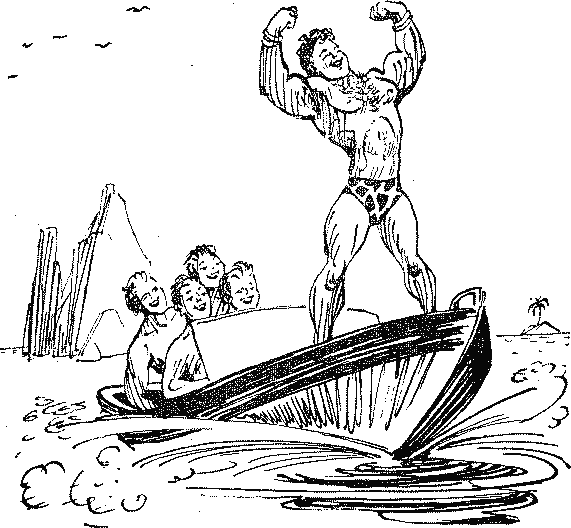 Вскоре путешественники были окружены толпой местных жителей. Волосатые крепыши скакали на четвереньках вокруг катамарана и дружелюбно хрюкали. Йон знаками показал, что хотел бы познакомиться с их культурой. Туземцы, прыгая друг через друга, что напоминало современную чехарду, повели его к подножию вулкана, над которым в те времена всегда колыхался султан розового ароматного дыма. У подножия вулкана изумленный Йон увидел гигантскую ржавую башню из еще неизвестных ему металлических сплавов. В мистическом ужасе туземцы упали ниц перед башней. Молниеносная догадка осенила Йона. Дождавшись ночи, Йон показал туземцам на ярко горевшее в черном небе созвездие Кассиопеи. Туземцы утвердительно захрюкали. Ночь огласилась нечленораздельными стенаниями, полными тоски по столь далекой родине. И тогда Йон понял все. Он понял, что далекие, очень далекие предки этих существ прибыли к нам на землю из пучин космоса. Впоследствии под влиянием благостного климата и огромных количеств вкусной дикорастущей еды астронавты обленились и забыли математику. Борьбы за существование на архипелаге по сути дела не было никакой, и в течение тысячелетий кассиопейцы стали травоядным племенем хрюкающих волосатых крепышей[6]. Жизнь на благодатном архипелаге пришлась Йону и его семье по душе. Вскоре они тоже забыли математику и растворились в местном населении. Оторванное от древнего мира тысячемильными водными просторами население эволюционировало очень медленно. В Китае был изобретен уже порох, в Европе уже пылали костры инквизиции, а островитяне еще не научились добывать огонь. Любопытно, что культ кассиопейской ракеты сохранился на Больших Эмпиреях до сих пор, хотя исповедует его лишь небольшая кучка островитян, в основном горные крестьяне. Гигантский тотемный столб, в который с тысячелетиями превратилась ракета, представляет удивительную загадку для ученых всего мира. «Зачем? — думали они. — Зачем нам тереть палку о палку, бить кремнем по кресалу, мудрить над паровой машиной, когда черепашьи яйца прекрасно выпекаются в прибрежном песке, а рыба варится в горячих лужах на склонах вулкана? Зачем нам, собственно говоря, порох, когда не с кем воевать, а дикие животные, привезенные Йоном, занимаются своим делом и никому не мешают? Зачем?» Нельзя сказать, что архипелаг совершенно не посещался завоевателями. Изредка посещался. Однажды, в III веке до нашей эры, островитяне проснулись от страшного скрипа. В океане качался гигантский деревянный корабль. Это был таранный корабль, построенный по приказу египетского фараона Птолемея Филафотора. Вот уже десять лет двести весел, к которым было приковано полторы тысячи рабов, несли этот жутко скрипящий корабль по мировым водам, и все эти десять лет три тысячи воинов, разделившись на партии носа и кормы, вели на палубе братоубийственную войну. Война была очень жестокая и увлекательная, с небольшими перерывами для приема пищи, которые происходили в общей трапезной в центре судна. Корабль, разумеется, во время войны не управлялся. Только этим и можно объяснить, что его занесло так далеко, и он сел на мель в виду нашего блаженного архипелага. Здесь, на мели, произошло решительное сражение, в ходе которого «партия носа» перебила «партию кормы» до последнего человека. Впрочем, «кормовики» не остались в долгу и ответили «