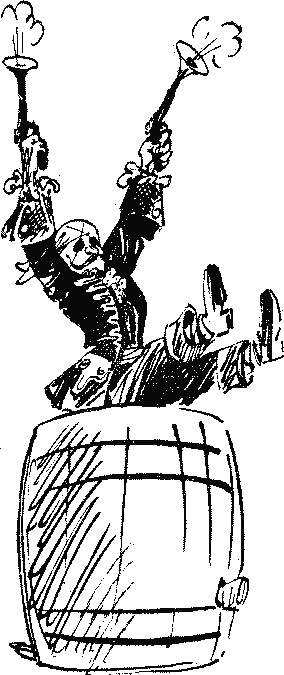 Луна спряталась за голову Серхо Филимоныч Страттофудо, когда Геннадий по водосточной трубе спустился на Сенатскую площадь. Огромная тень памятника закрывала половину площади, и в этой тени за неосвещенными окнами маленького кафе мерцали сигаретки эмпирейских легоперов. — Геннадий, — бросились к нему сенатор Куче, Рикко Силла и Токтомуран Джечкин. — Как мы рады снова видеть вас, потомка нашего памятника, в добром здравии! — Спокойно, друзья, сейчас не время для сантиментов! — жестко сказал мальчик. — Есть у вас оружие? — Есть! — гордо ответил Джечкин. — Шпаги, абордажные сабли, двухствольные пистолеты, пики! Мы очистили весь национальный музей. Геннадий только усмехнулся, вообразив себе вооруженное таким образом войско, сражающееся против Ричарда Буги. — Ну хорошо, оружие у вас будет, — сказал он. — Ответьте мне только на такой вопрос. Сможете ли вы за два часа достать двадцать четыре скрипки, шесть виолончелей, шесть контрабасов, десять труб, семь флейт, три кларнета, две арфы, пять гобоев, четыре валторны?… — С валторнами у нас плохо, — прикинул сенатор Куче. — Я достану валторны, — решительно заявил Рикко Силла. — Прекрасно, — сказал Геннадий. — Теперь слушайте, друзья… Через час Геннадий соскользнул по громоотводу прямо ко входу в отель «Катамаран». В отеле все шло по плану. В зале ресторана Джон Грей — Силач-Повеса накачивал «товарищей по оружию». Он стоял посредине огромного стола, размахивал большим, как флаг, эмпирейским велюром и пел: