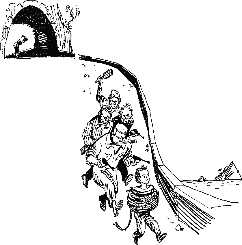 Со второго этажа, из кафе, смотрели на площадь командир корабля Аллигейтер и инспектор Интерпола Румпельштильцхен. — Слава богу, все кончилось благополучно, — устало вздохнул инспектор. — Ты доволен? — спросил летчик. — Еще бы. — Но ведь ты никого не поймал, Румпель. — Хорошо, что они нас не поймали… В темноте моргали стоп-сигналы выезжающих на автостраду машин. Геннадий не знал, видели ли Буги с Чангом, как он прыгнул в «роллс-ройс». Лежа на полу, он не слышал ни одного их слова: переднее сиденье было отделено от задних перегородкой из толстого стекла. Он почувствовал, что «роллс-ройс» идет на сумасшедшей скорости, не меньше 150 километров в час. Следовательно, они едут в сторону от Лондона, по большому городу так не поедешь. Оторвались ли они от погони? Во всяком случае, дело принимало неплохой оборот. «Я решил быть с вами до конца, мистер Буги, — скажет он. — Спина к спине у мачты, сэр…» Скорость вдруг резко упала. Машина сделала поворот и поехала по боковой дороге. Блики большой автострады перестали мелькать по стенкам. Машина остановилась, открылась передняя дверь, голос Буги прогудел: — Слышал, Чанг? Они проскочили мимо. Сейчас мы смоемся, а потом рассчитаемся с ними на островах Кьюри… Он захлопнул дверь, развернул машину и поехал назад к автостраде. Перед выездом был небольшой подъем. Буги включил вторую передачу, и вдруг машина дернулась, взревел мотор. Почувствовав неладное, Геннадий поднял голову и увидел, что передний отсек «роллс-ройса» наполнился голубоватым светящимся дымом, в котором, словно припадочные, бились Буги и Чанг. Судороги продолжались несколько мгновений, потом Буги и Чанг уронили головы. Геннадий увидел двух подбегающих мужчин в странных масках. В руках одного из них было короткое ружье с широким, будто бы стеклянным стволом. Второй распахнул дверку машины, нажал на тормоз, выключил зажигание. Светящийся газ мгновенно испарился. Нападавшие сняли маски, деловито приступили к обыску бесчувственных Буги и Чанга. Геннадий заметил, что широкоствольное ружье лежит рядом с машиной на асфальте. Он выскочил из машины, схватил ружье и, увидев изумленные физиономии старшего стюарда и его дружка, нажал спусковой щелчок; мелькнул узенький язычок огня, «роллс-ройс» вновь наполнился голубым дымом. Геннадий бросился прочь и упал в кювет — носом в мокрую траву. Когда потомок великого императора Рокера I очнулся, он увидел над собой ясные, доброжелательные глаза Джина Стрейтфонда. — Что произошло? — заплетающимся языком пробормотал Буги. — Все в порядке, сэр. Они связаны, — бодро ответил мальчик. — Откуда ты взялся? — Всегда с вами, сэр. До конца. Спина к спине у мачты. Ричард Буги со стоном приподнялся, увидел связанных врагов, икающего Чанга и расхохотался: — Ей-ей, ты мне по душе, малый!