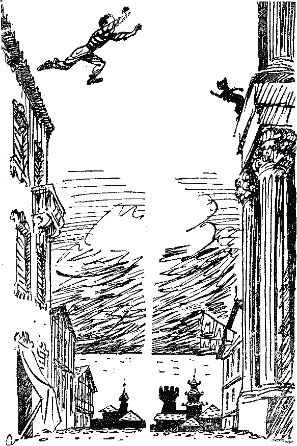 — Что-то с рифмой у вас не в порядке в последней строфе, — сказал Шуткину Геннадий. — Это от волнения, — пояснил кот. — В минуты волнения иногда сбиваюсь на прозу. Пойдемте? Дальше последовал головокружительный рейд по заборам, водосточным и домовым трубам, карнизам, скатам крыш, по мусорным бакам, деревьям и даже по флюгерам. Несмотря на невероятную скорость, Геннадий успел заметить, что все местные животные, включая ручных леопардов, немедленно прятались при виде несущегося под луной боевого кота с качающимся, как дым, хвостом. Геннадий задыхался, пот лил с него градом. Он не мог понять, как до сих пор не сорвался. Наконец Шуткин кубарем свалился со шпиля кафедрального собора и растянулся в маленьком водосточном желобке на высоте не менее тридцати метров. Геннадию ничего не оставалось, как последовать за ним.